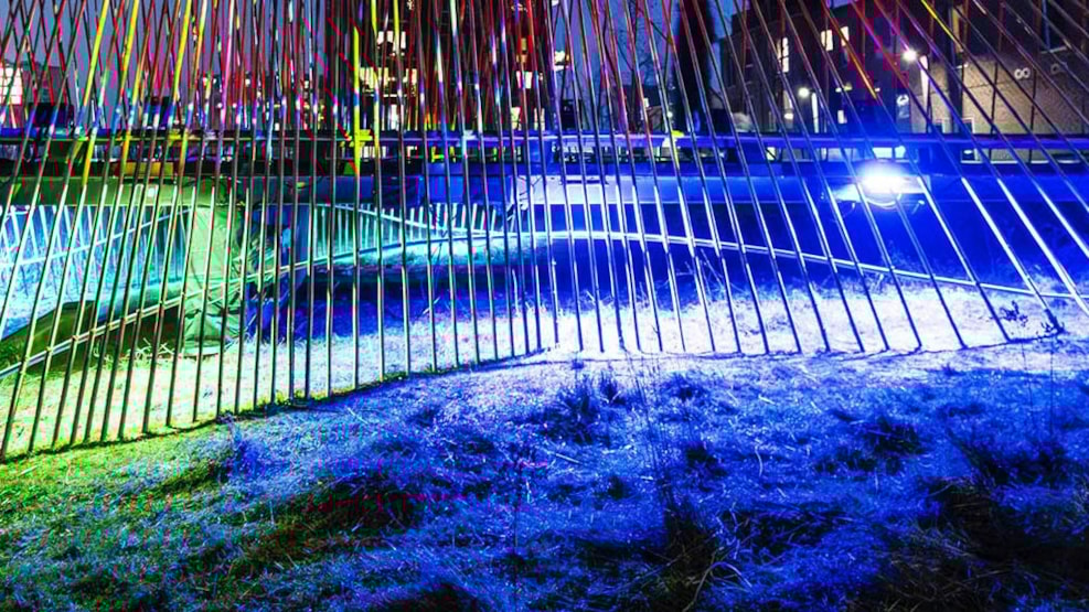 Die Installation schafft ein lebendiges Zusammenspiel von Licht und Schatten und lädt das Publikum ein, in eine räumliche Erfahrung einzutreten, in der Natur und Technologie aufeinandertreffen.